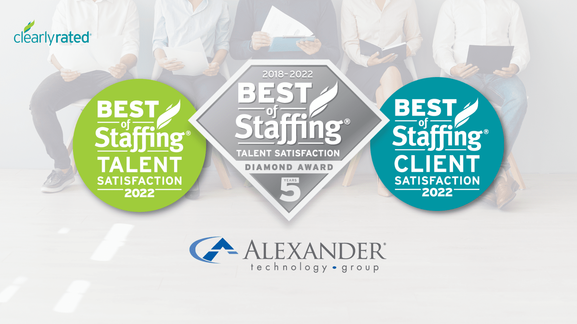 Bedford, NH – Alexander Technology Group, a BANKW Staffing company and a leading technology staffing agency, announced today that they have won the Best of Staffing Talent 5 Year Diamond Award for providing superior service to their candidates for at least five (5) consecutive years. Presented in partnership with presenting sponsor Indeed and gold sponsor Talent.com, ClearlyRated’s Best of Staffing® Award winners have proven to be industry leaders in service quality based entirely on ratings provided by their candidates. On average, job seekers who work with winning agencies are twice as likely to be completely satisfied with the services provided compared to those placed by non-winning agencies. Winners who earned the Diamond Award distinction have won the Best of Staffing Award for at least 5 years in a row, consistently earning industry-leading satisfaction scores from their candidates.